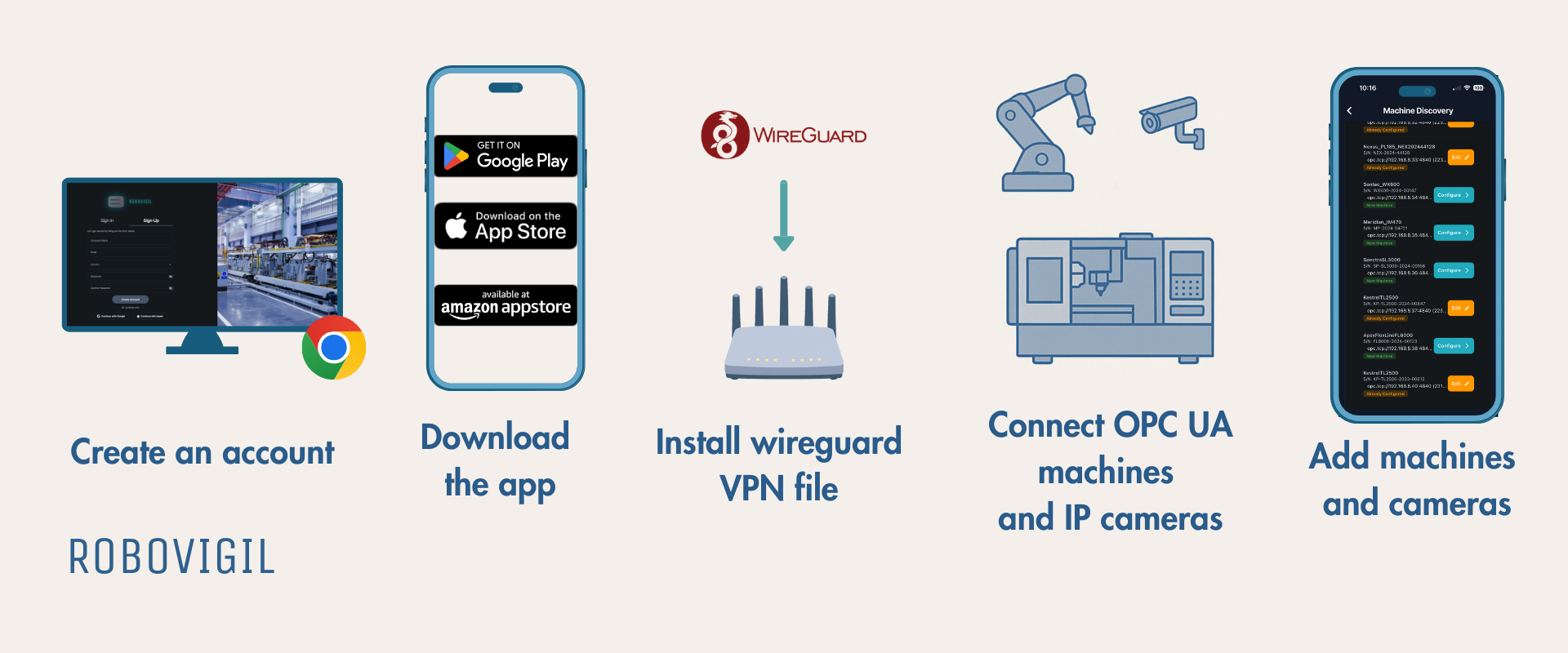 RoboVigil is software-only. There’s nothing to install on your factory floor. You provide three things: